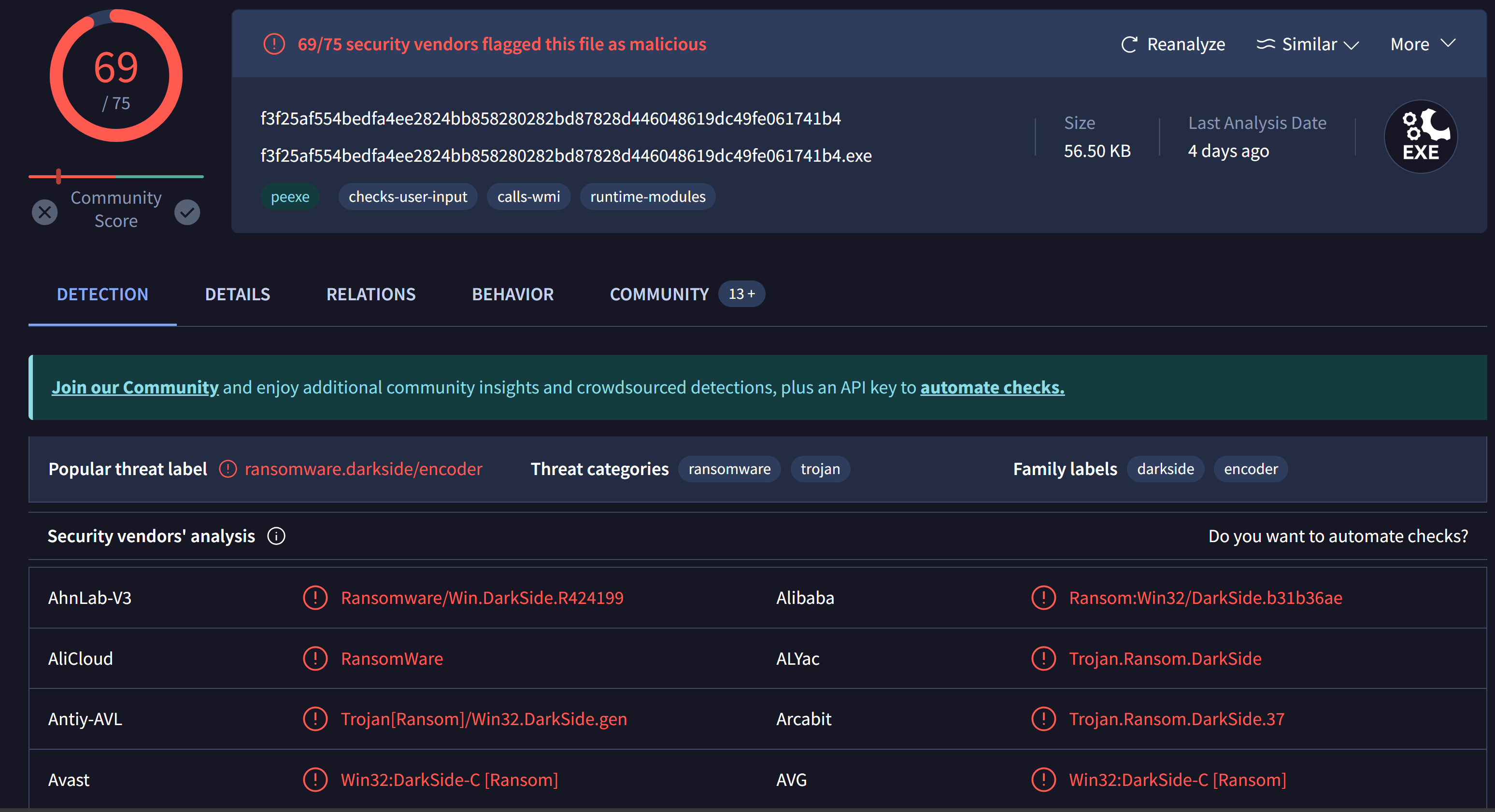 Using VirusTotal we will find 69/75 security vendors flagged this file as malicious.