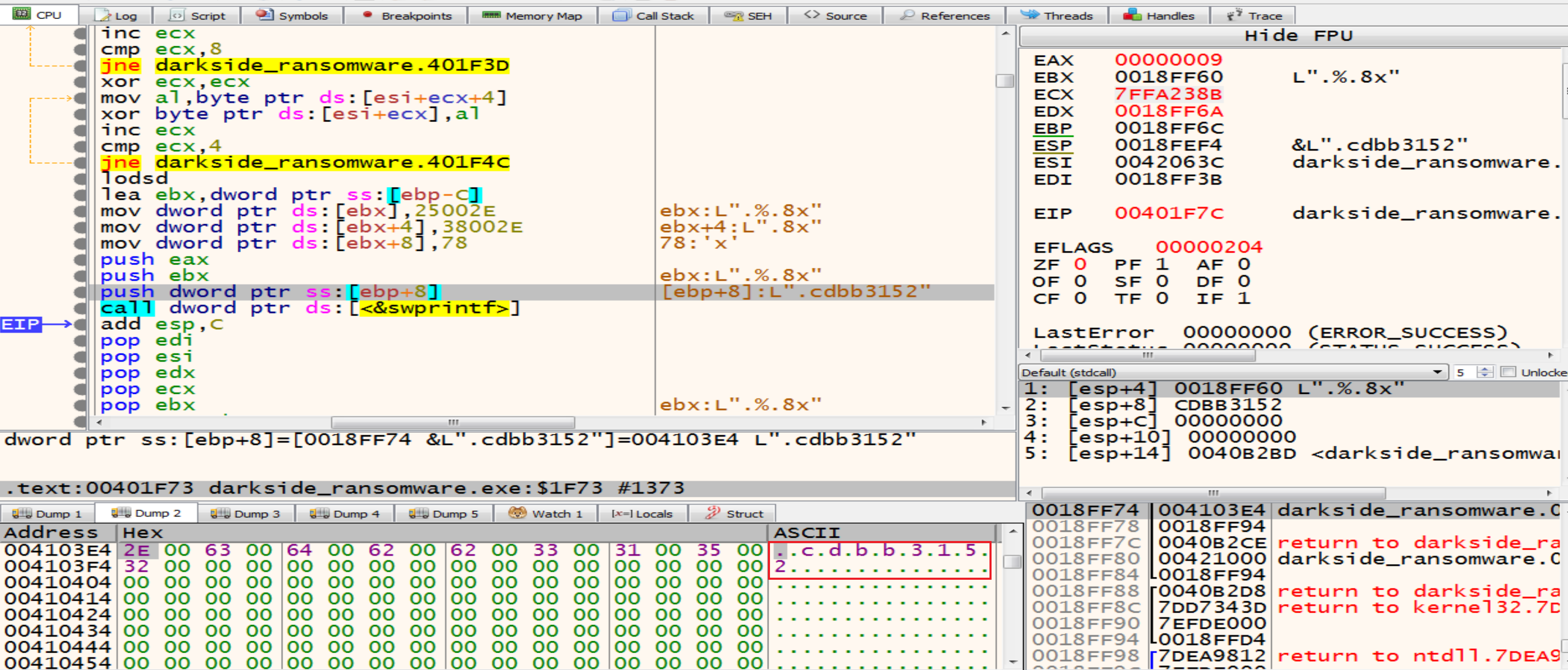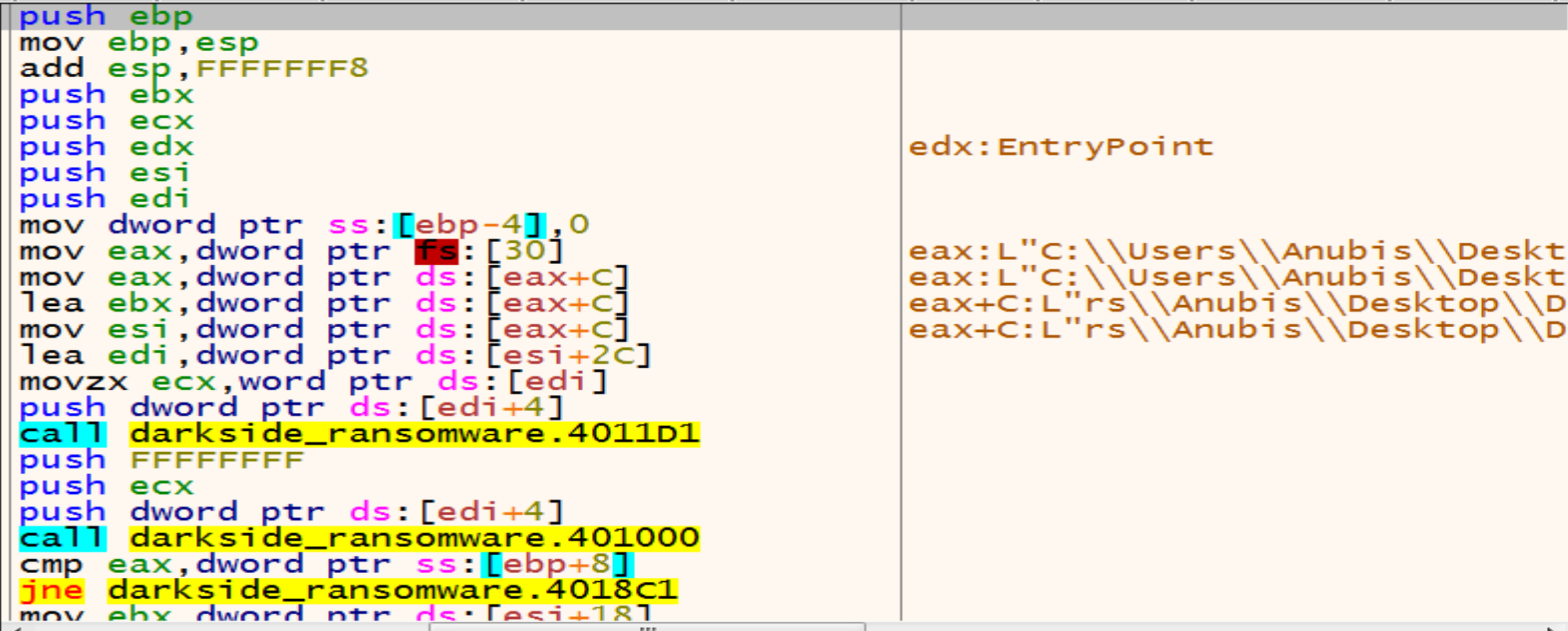 And if we put a breakpoint after this jump jne darkside_ransomware.4018B3 we will see that the malware will get LoadLibraryA.