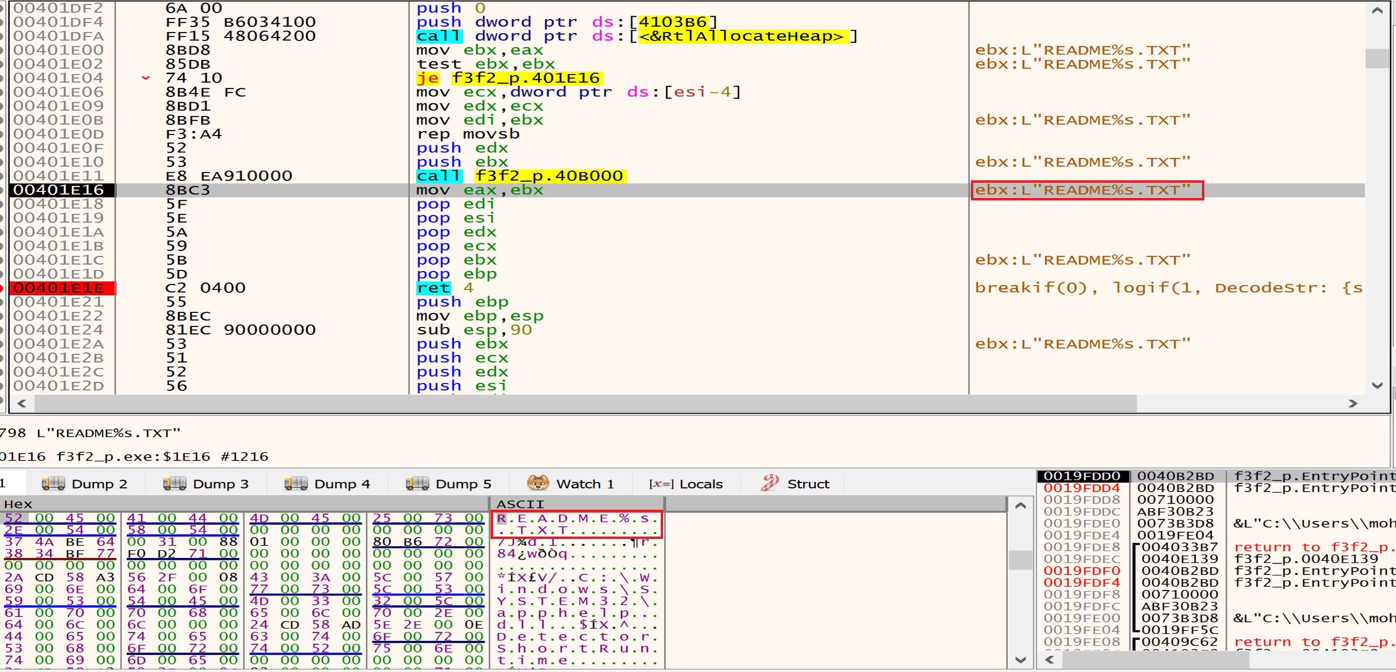 Malware will allocate a space in the memory to put his encrypted data and will decrypt it using his algorithm as we can see it in the next figure in IDA PRO, we will see the name of the his private file named "README.1a7cfdf5.TXT" in which he tells us in it that our files have been encrypted and in which he asks us for ransom and how to pay it.