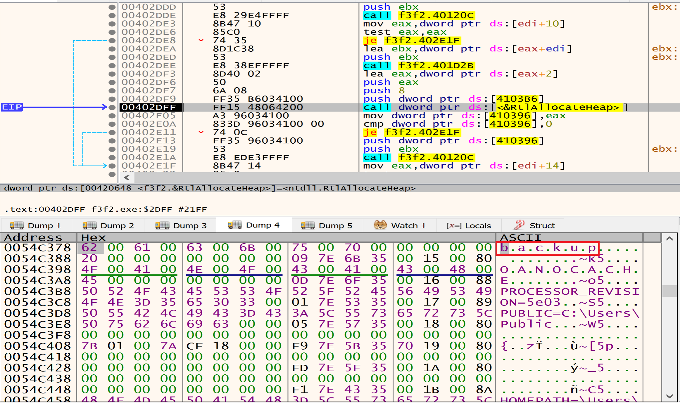 Malware calls RtlAllocateHeap API to allocate memory heap to store something encrypted in it.