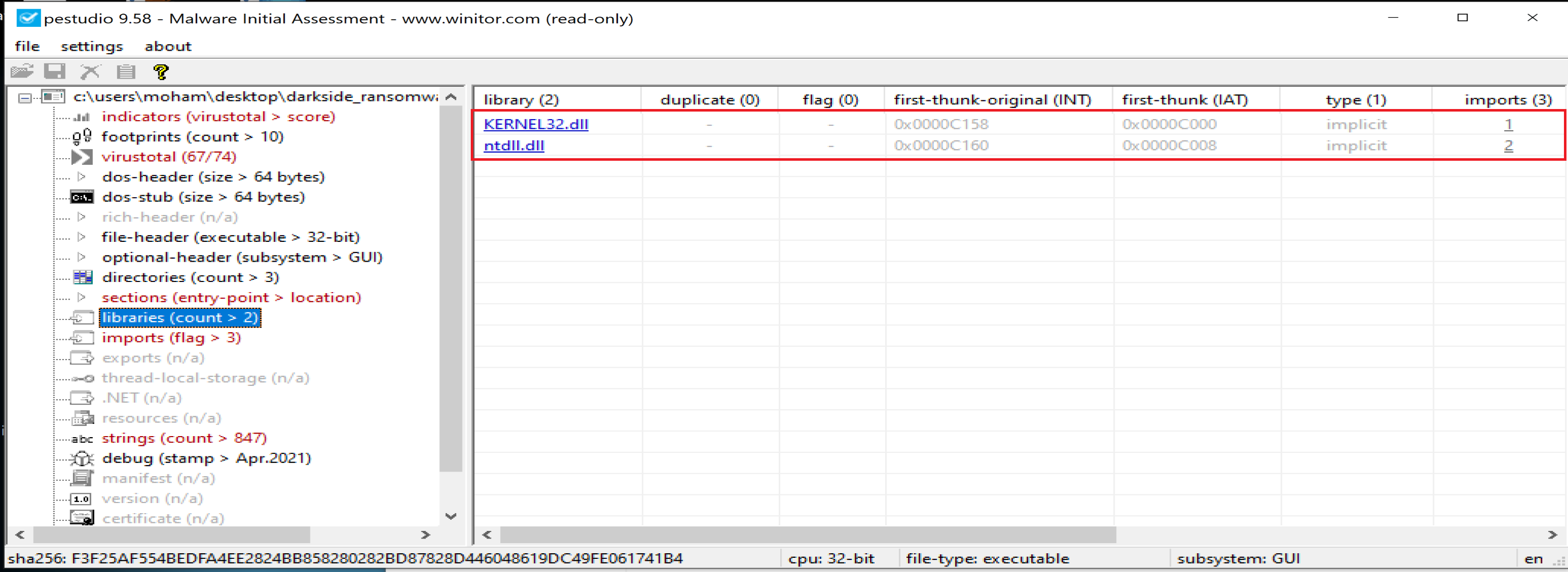 Malware will call 2 libraries named KERNEL32.dll and ntdll.dll.