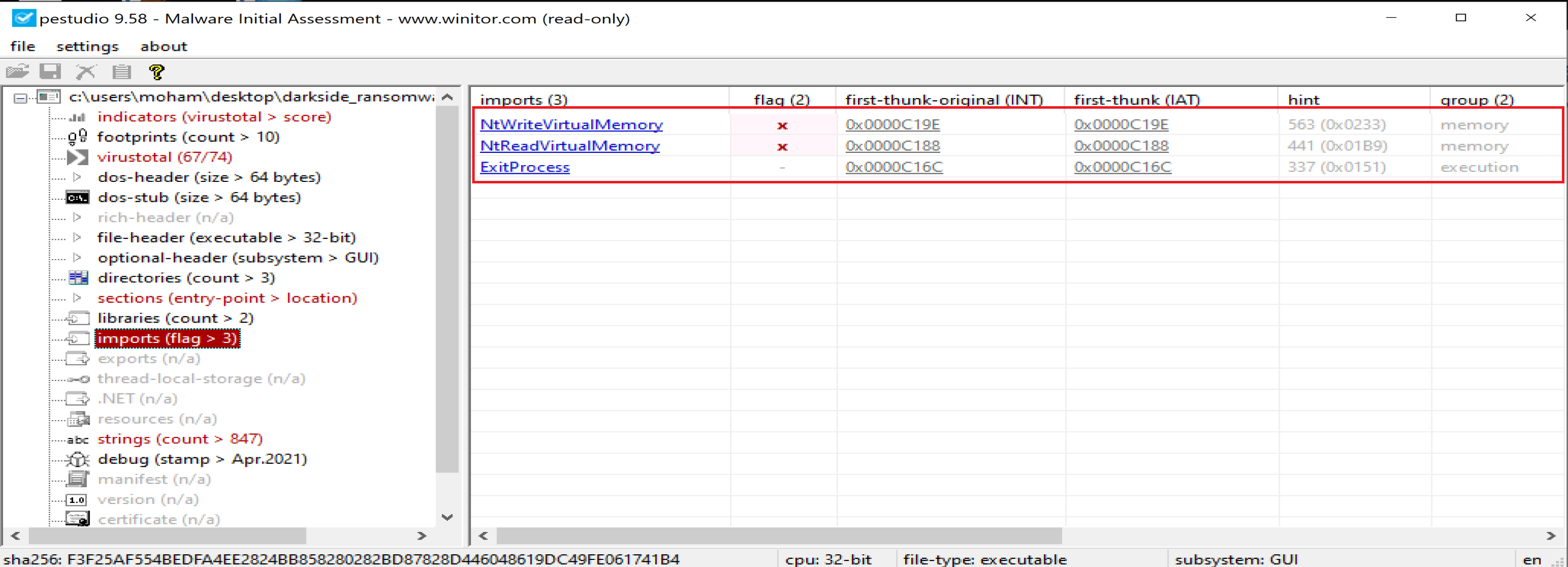 Then malware will import 3 functions called NtWriteVirtualMemory, NtReadVirtualMemory and ExitProcess from previous libraries.