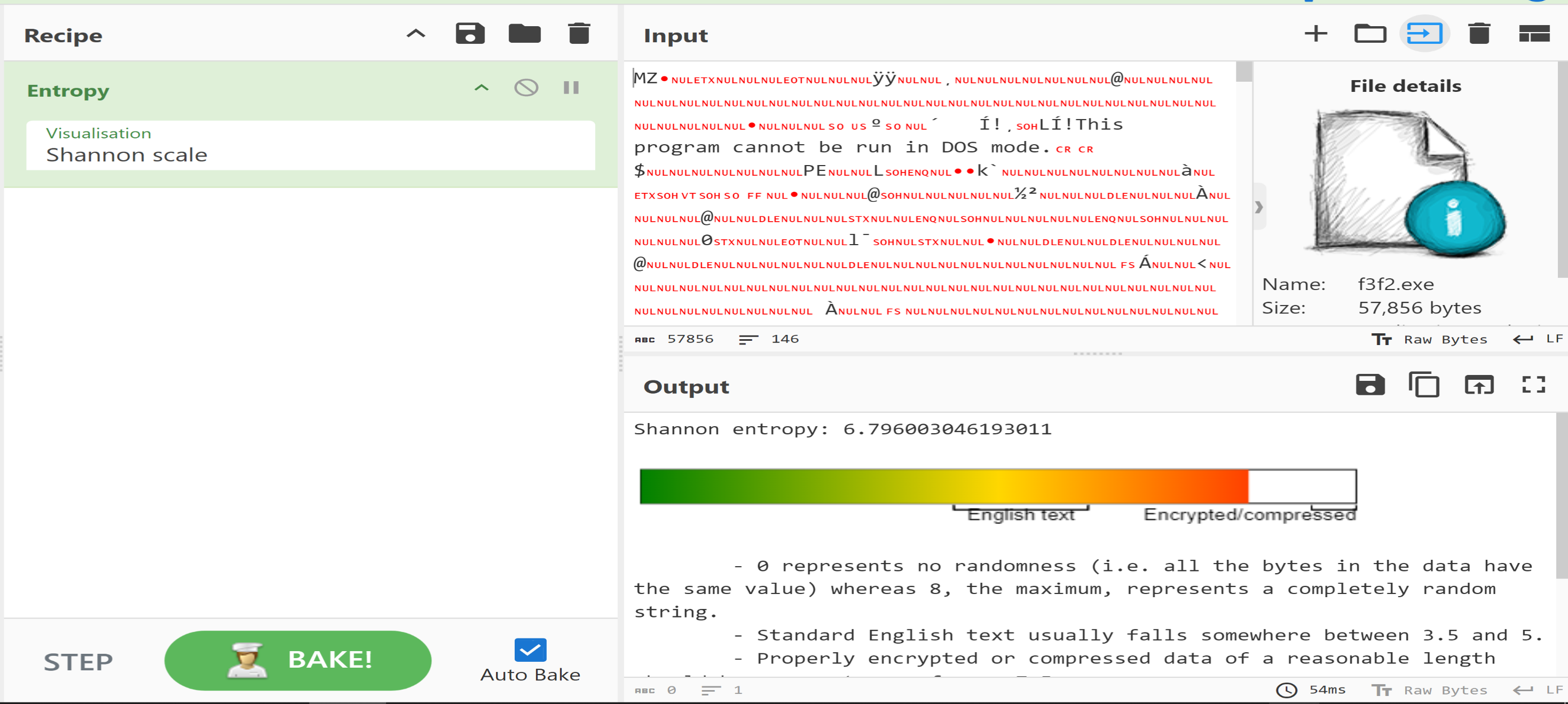 Using CyberChef we will find the file entropy is 6.8 but the file is not packed but he has a lot of encryption methods.