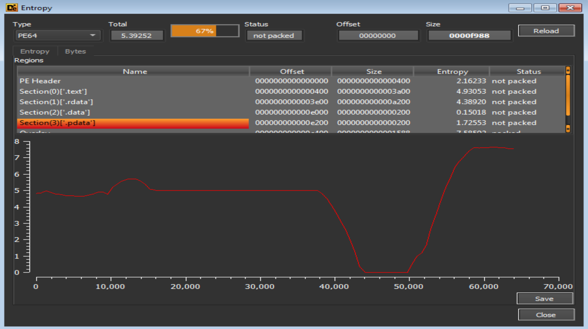 Diewe will notice that the Entropy is very high but the file is not packed, this may indicate to the Encryption methods is a lot.