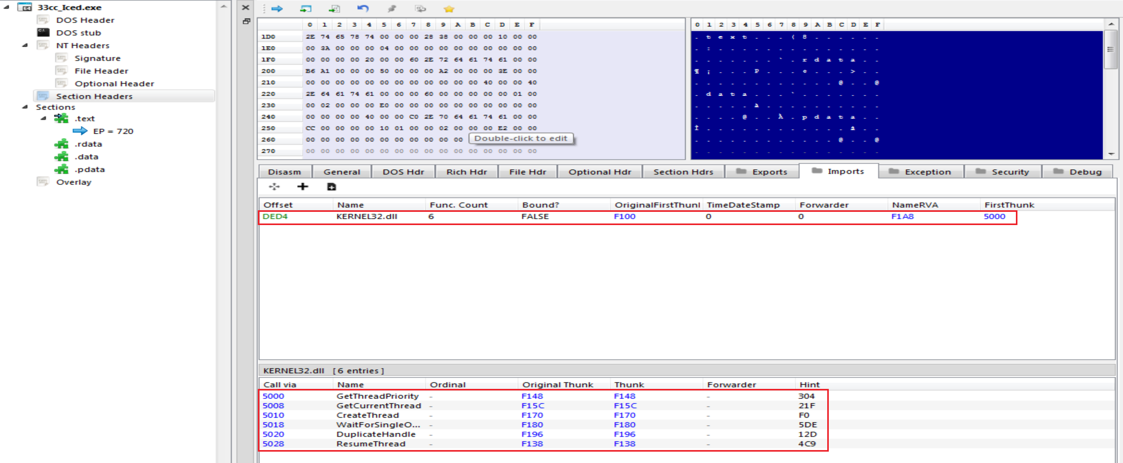 Using PE-bear we will find 1 library called KERNEL32.dll and ther is 6 imports calling from it like: