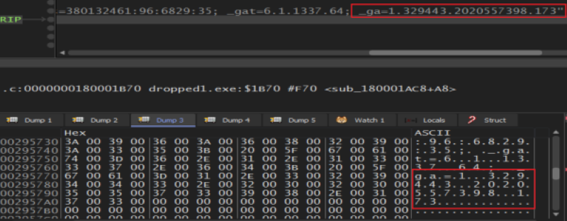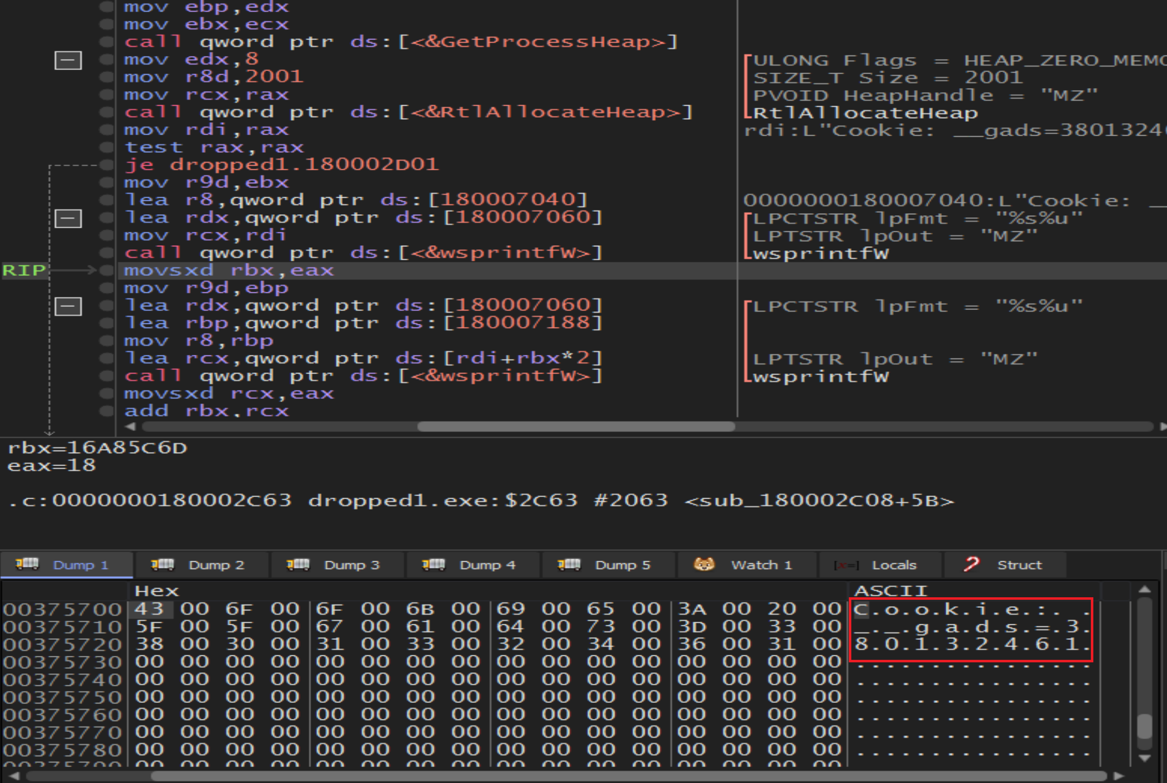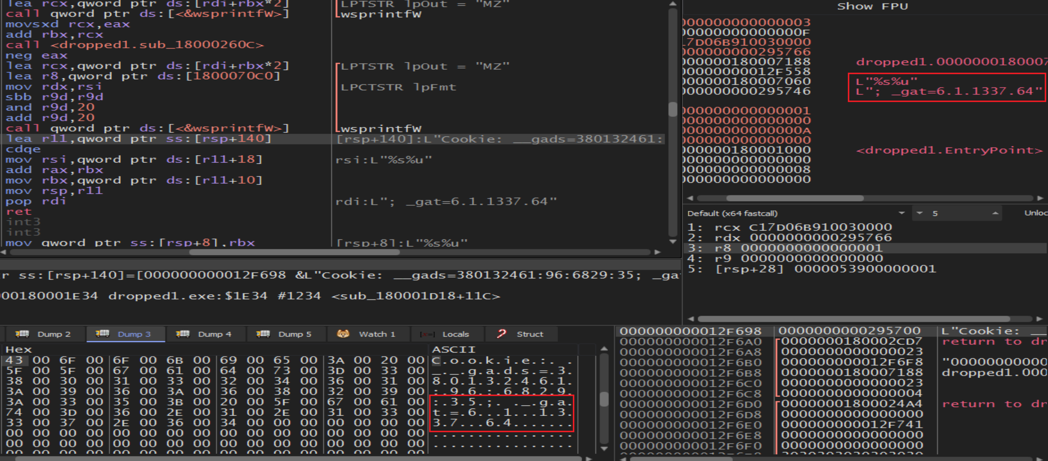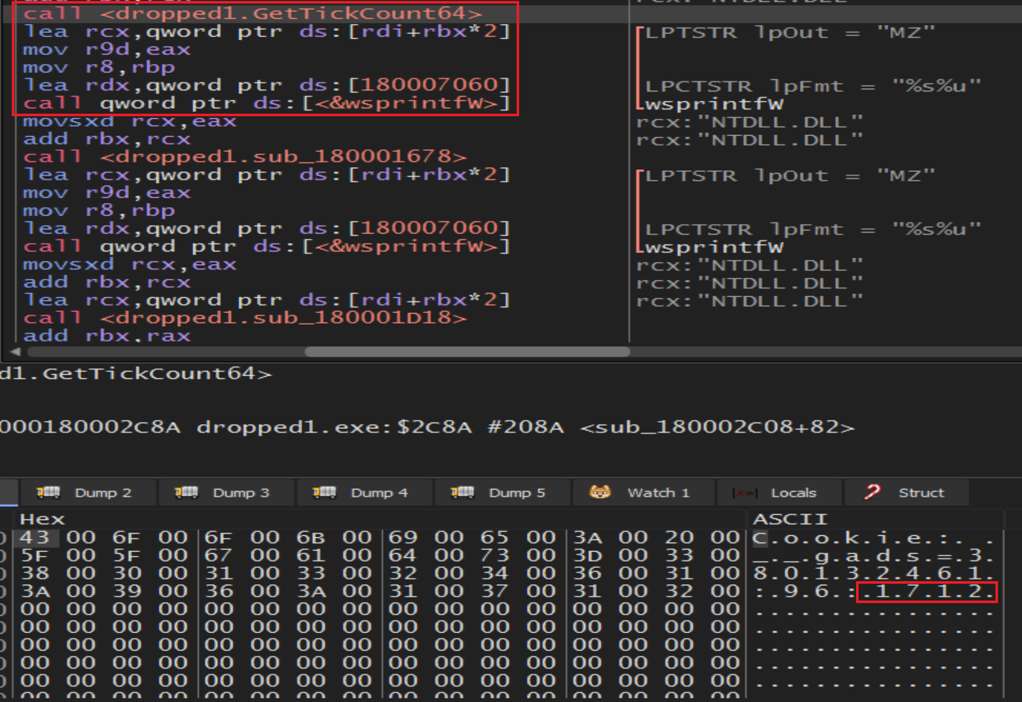 Malware get information about GetTickCount64 and will add it to the cookies by call wsprintfW.