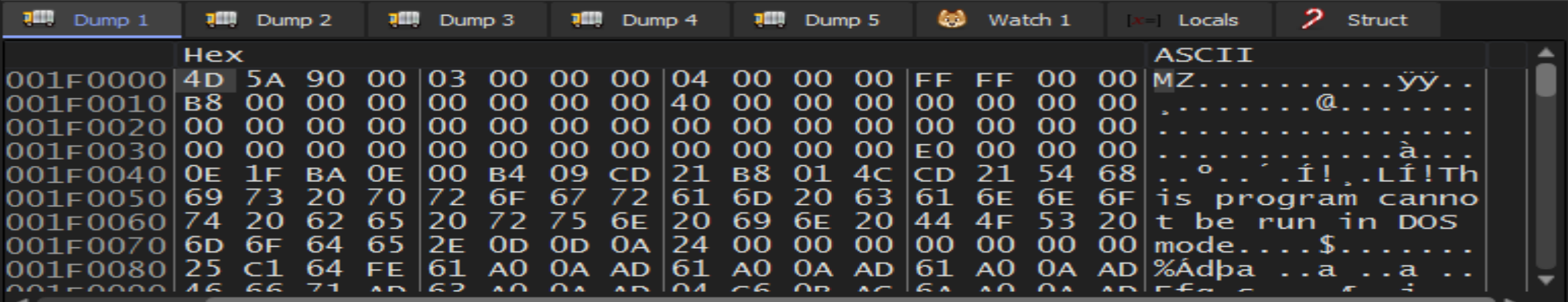 And here it is our memory dump is full with data starting with MZ so, we have a new PE file lets start to make an analysis to it.