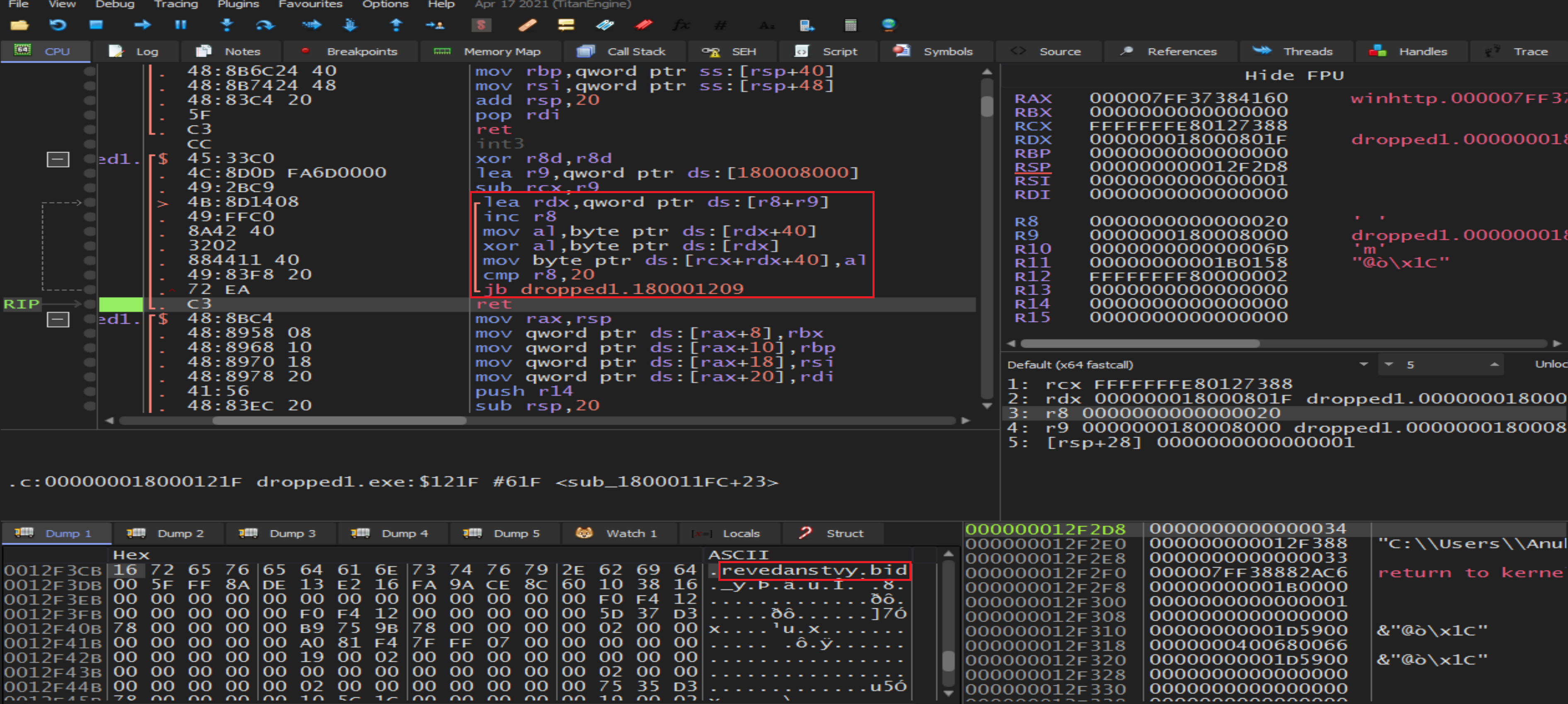 So, by get in the loop and follow the memory address in Dump we will find string that may be the attacker host revedanstvy.bid.