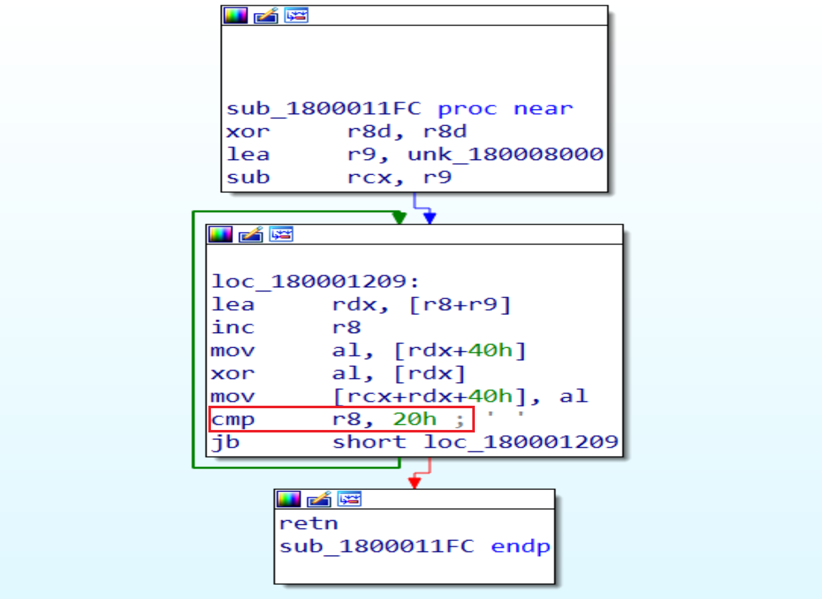 Malware will get in a loop to decrypt some thing and at the end of the loop he will compare register r8 20 times to get out from it.
