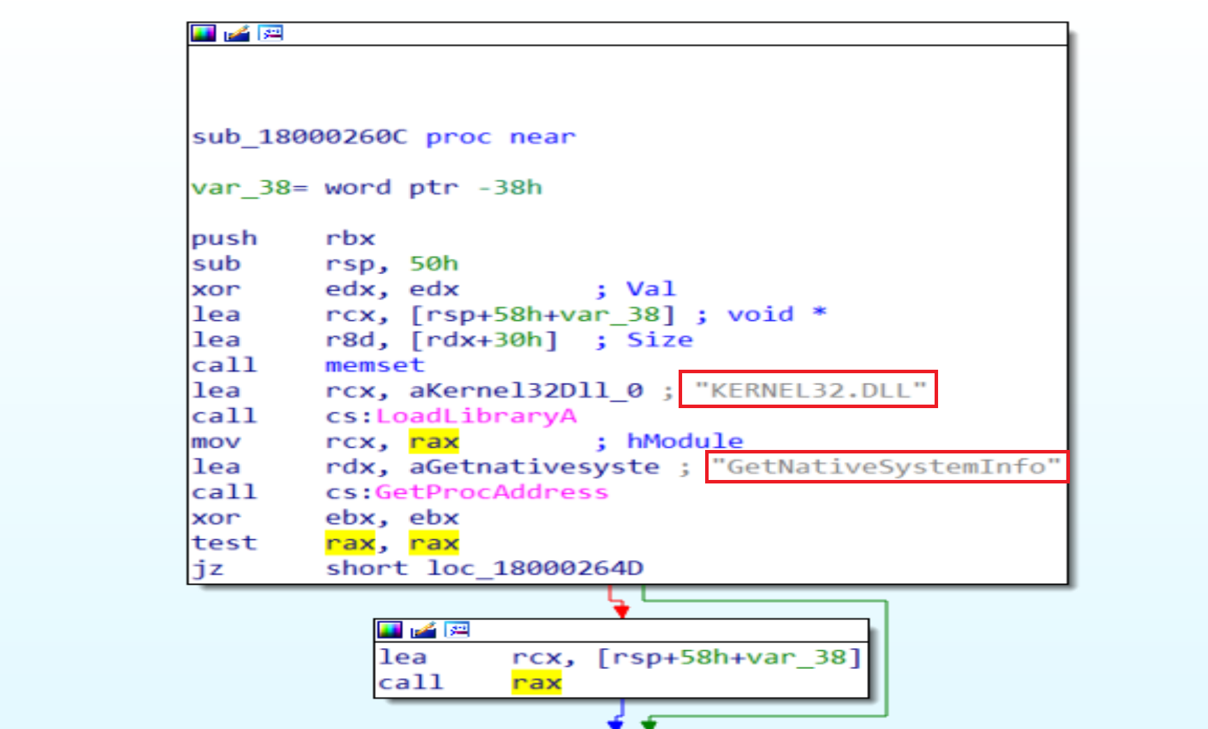 Malware will Load Kernel32.DLL get process address of GetNativeSystemInfo ready to calling it to get some information about the system.