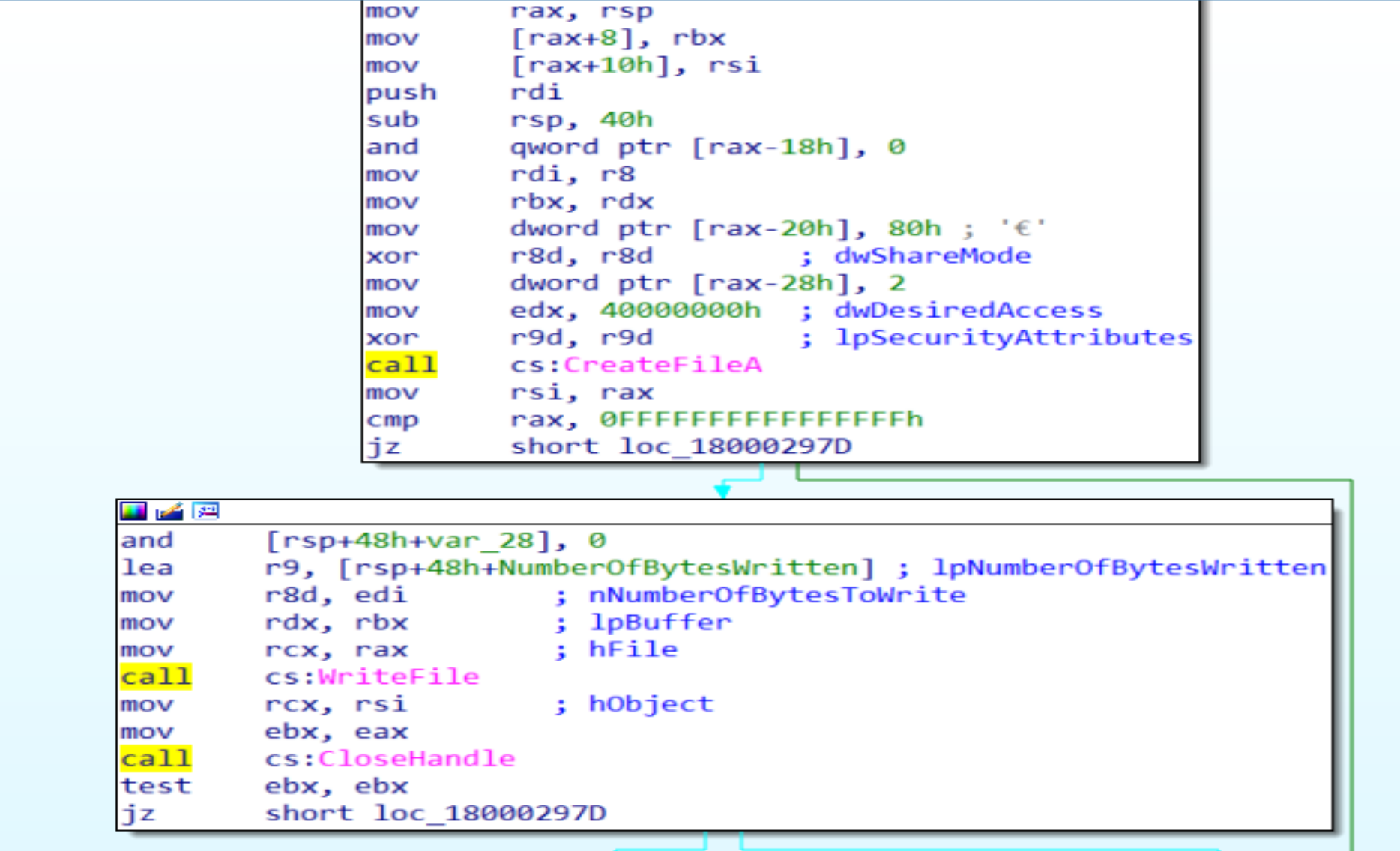 Then Malware will call functions like CreateFileA, WriteFileA to make a file and write all the extracted data in it to send all of them to the C2 Server(Attacker Server) by using functions like: