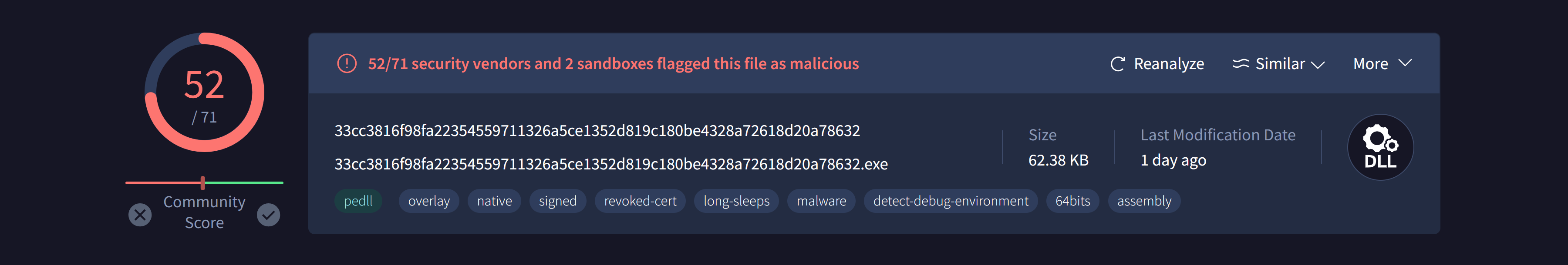Using VirusTotal we will find 52/71 security vendors and 2 sandboxes flagged this file as malicious.